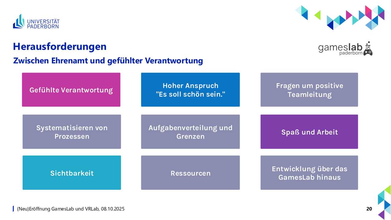 Die Aufrecherhaltung des GamesLabs und dass es weiterhin relevant und wichtig bleibt sind Dinge, für die sich die Orga einsetzt. Bereits die Orga-Generationen vor uns haben Hinter den Kullissen technische, inhaltliche, organisatorische, bürokratische, oder ressourcenbasierte Hürden managen müssen – und das ist bis heute ein großer Teil der unsichtbaren Orga-Arbeit, für den wir aktiv Lösungen versuchen zu entwicklen.