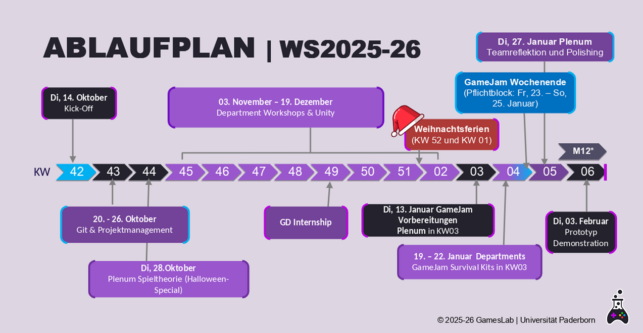 Im Wintersemester ist das Seminar in PAUL Bereich Medienwissenschaften unter den Namen GamesLab: Videospieleentwicklung und Game Studies (bis einschließlich SoSe 2025 ehemals als „Projektmanagement in der Computer- und Videospielindustrie 1“ bekannt) anwählbar. Teil 2 ist im Sommersemester anzuwählen. Dabei findet Ihr den Kurs wahrscheinlich in euren gewohnten Modulen oder unter Eurem Studium Generale.